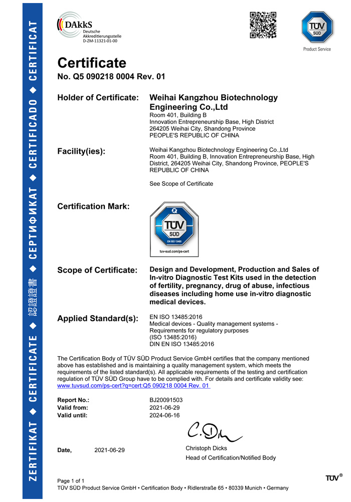? ? ?威??抵萆锕こ逃邢薰境闪⒂?013年,公司坐落于風景秀麗的海濱小城——威海市??抵萆锸羌邪l、生產和銷售于一體的生物科技公司,與威海哈爾濱工業大學合作研發團隊,擁有先進的科研基地及生產基地。主要從事快速診斷檢測產品的研發、生產、銷售。產品涵蓋:生育檢測、藥物濫用檢測、農藥殘留檢測以及其他臨床診斷檢測等。公司自主研發生產得早早孕試紙,排卵檢測試紙,毒品檢測及疾病檢測等醫用產品,經過歐盟認證,產品質量穩定,值得信賴。